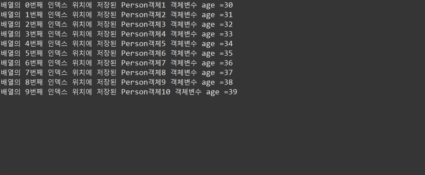 System.out.println("배열의 " + i + "번째 인덱스 위치에 저장된 Person객체" + (i + 1) + " 객체변수 age =" + pa[i].age);
