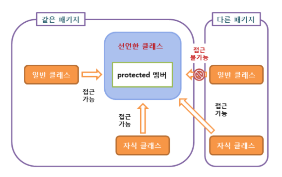 같은패키지의 멤버들은 전부 접근 가능하고, 다른 패키지라도 선언한 클래스를 상속받은 자식 클래스는 접근 가능한 지정자이다.