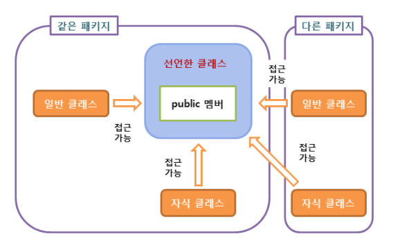 가장 넓은 범위의 접근 지정자로 해당 객체를 사용하는 프로그램은 어디서나 직접 접근할 수 있다.