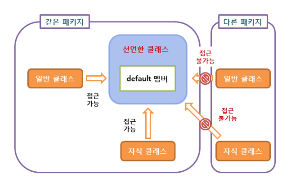 별도로 접근지정자를 지정하지 않을경우 default가 기본값으로 지정된다. 패키지단위로 접근을 제한함으로, 같은 패키지 내에서는 전부 접근 가능하고 다른 패키지에서는 접근이 불가능하게 된다.